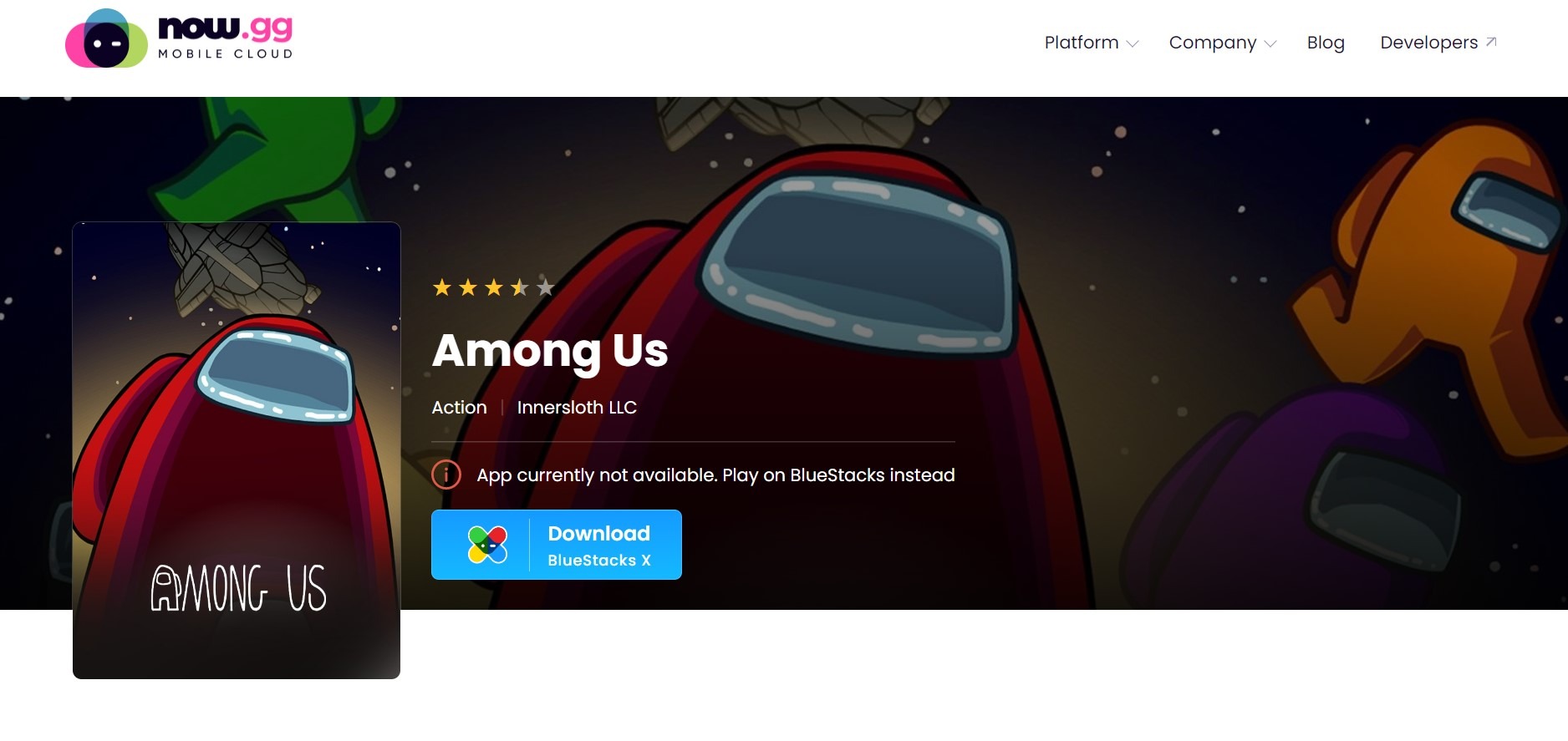 However, going back to the Among Us now.gg homepage, there are some instances when the “Play in browser” button will not be available. In this case, proceed to the next option now.gg provides, which is downloading BlueStacks and playing on this platform instead. Click on the button that says “Download BlueStacks X.”