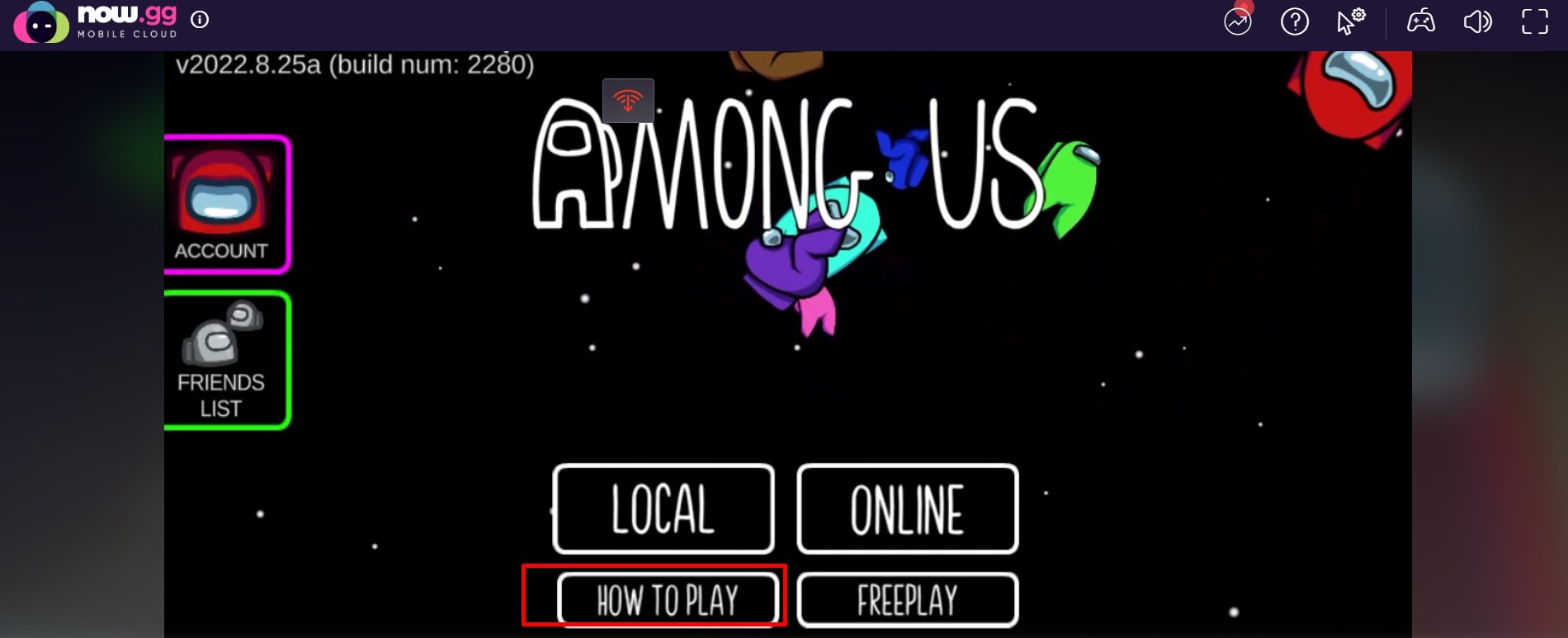 Several options are provided for you regarding how you want to play Among Us via now.gg. These include “Local,” “Online,” and “Freeplay.”