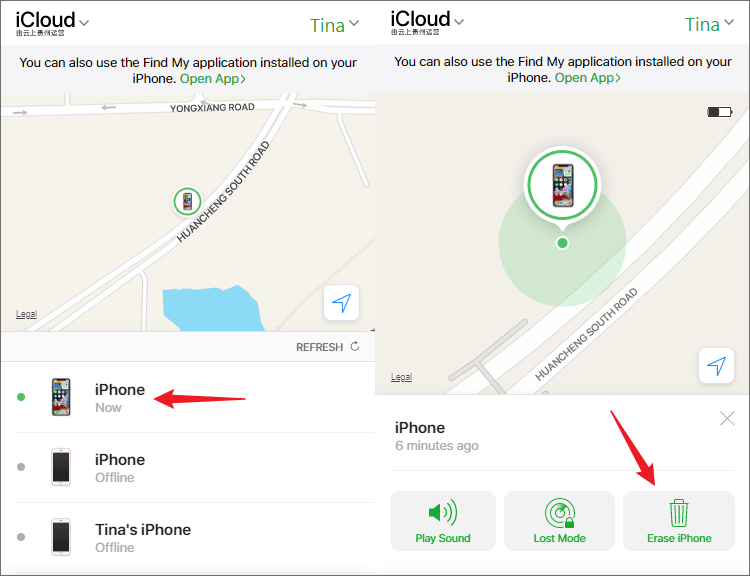 Step 3: When you’re in the Find My app, all iOS devices associated with the Apple ID account will show up here. Tap to select the iPhone whose password you forgot, and then tap Erase iPhone.